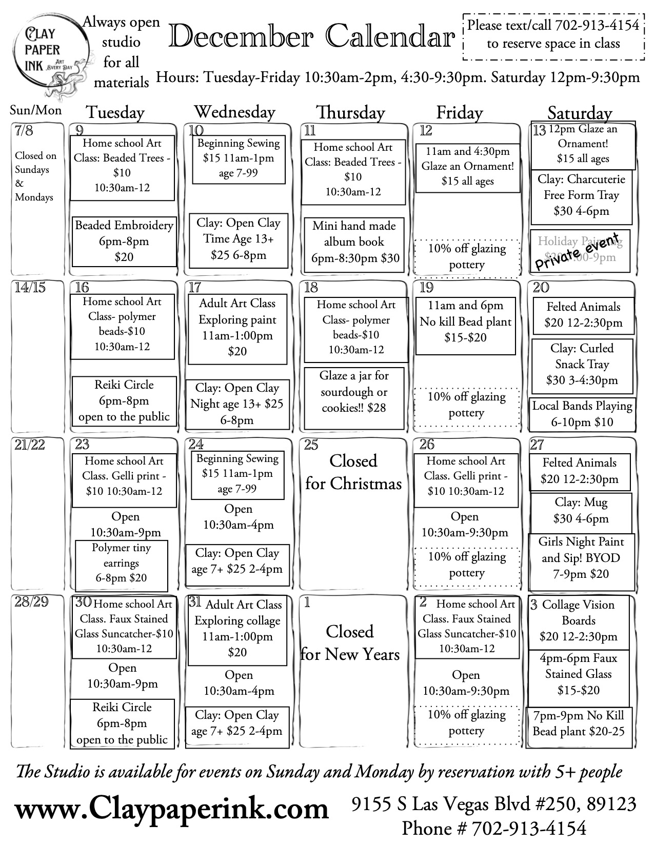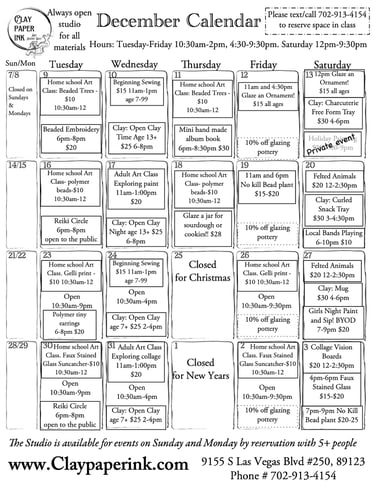 Clay Paper Ink Calendar of Events and Activities.